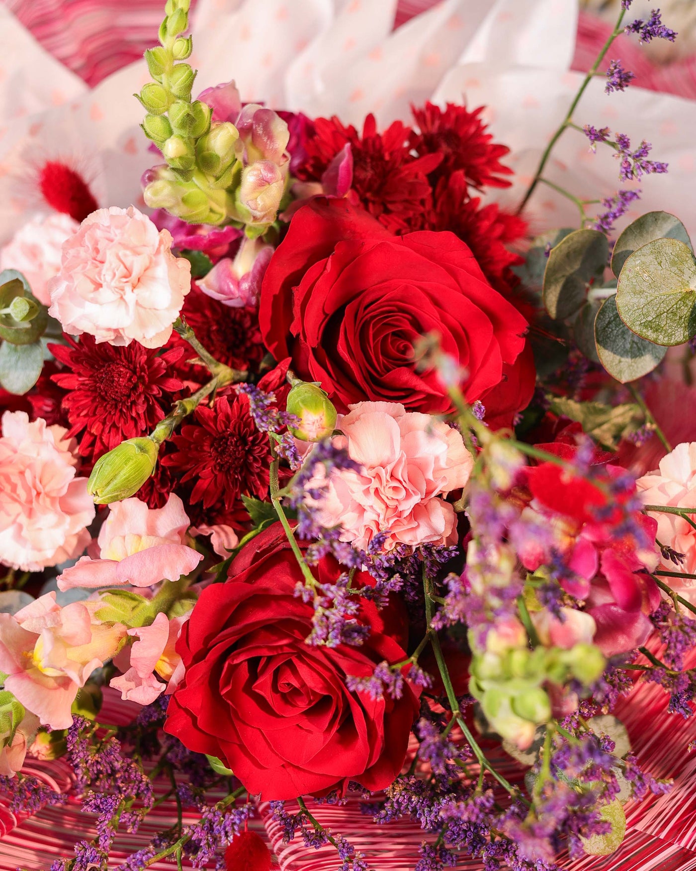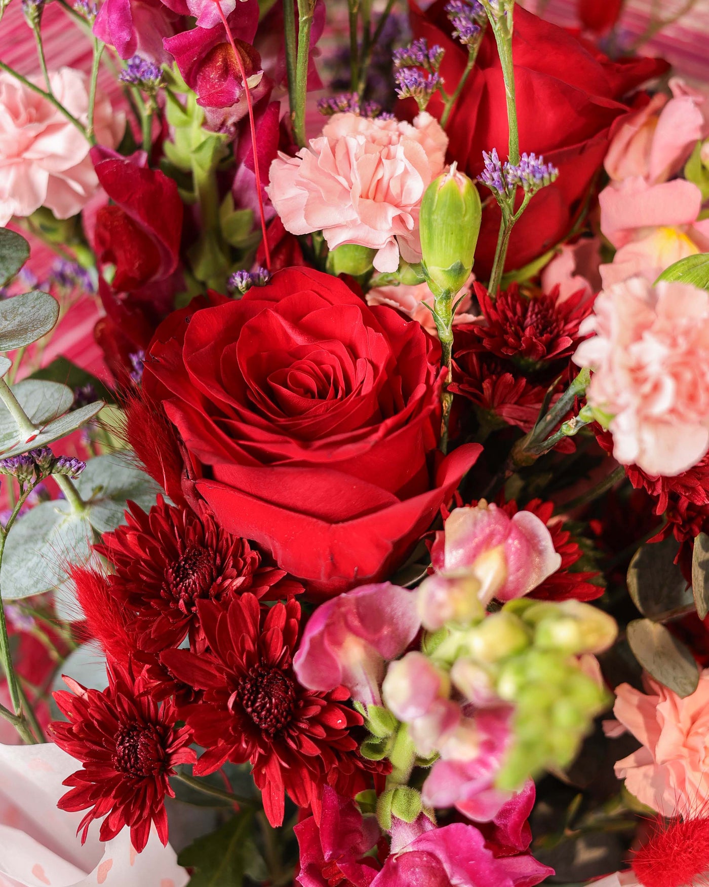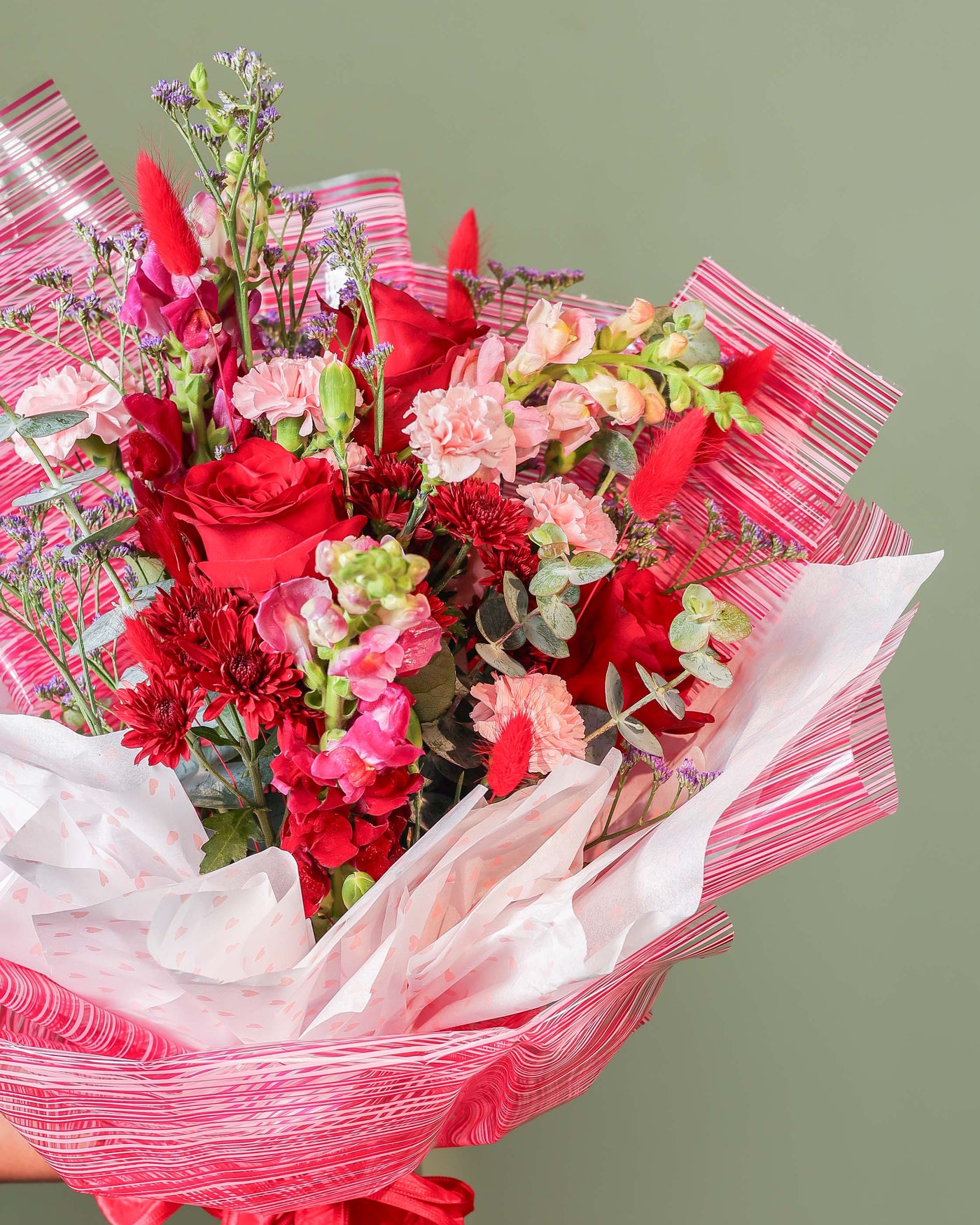This romantic core is surrounded by an artistic meadow of red chrysanthemums, light pink carnations, and playful bunny tails. With the added height of snapdragons and the soft texture of limonium and eucalyptus, The Triple Promise is a poetic way to speak from the heart. It is elegantly hand tied and wrapped in signature textured paper, finished with a classic red ribbon.