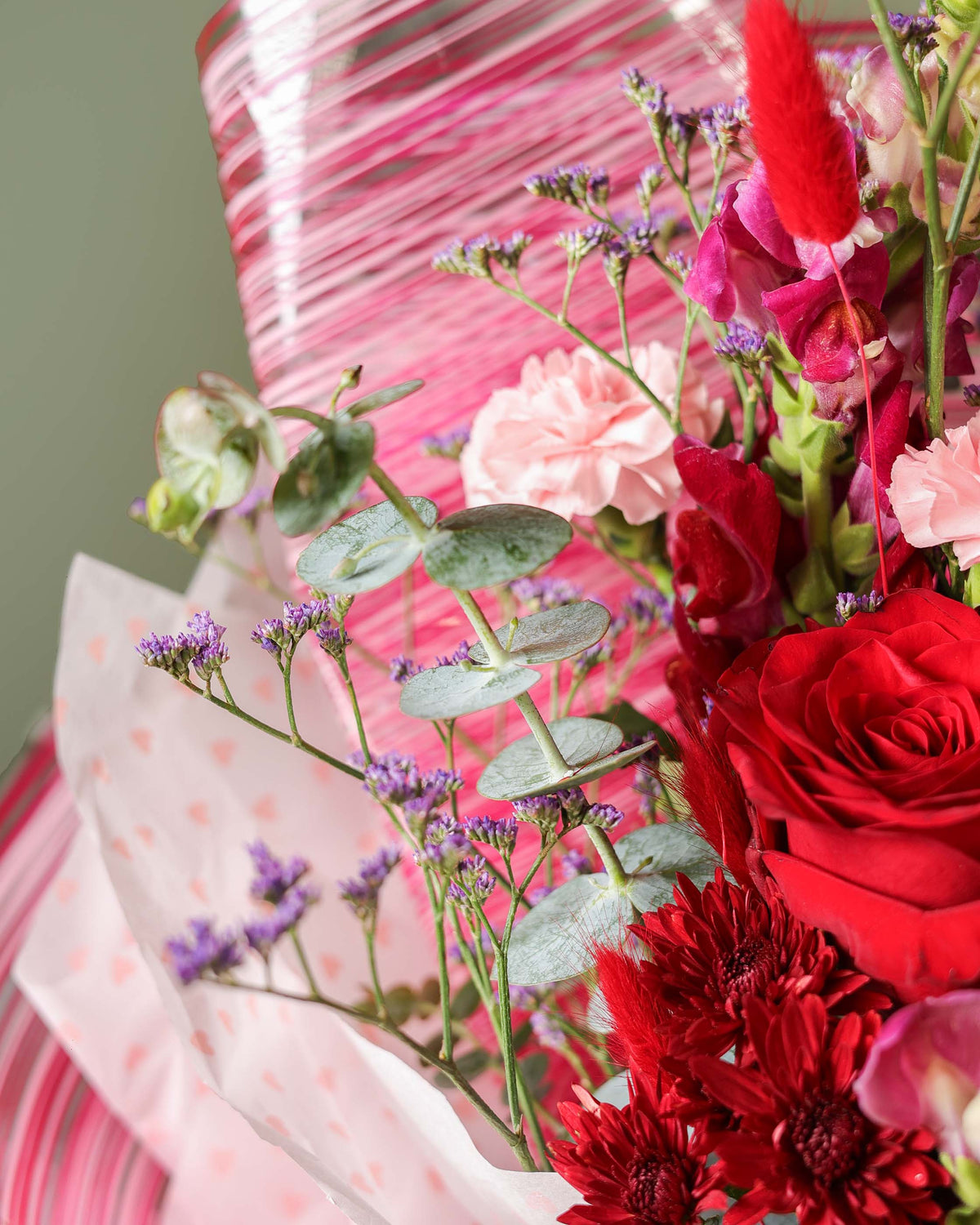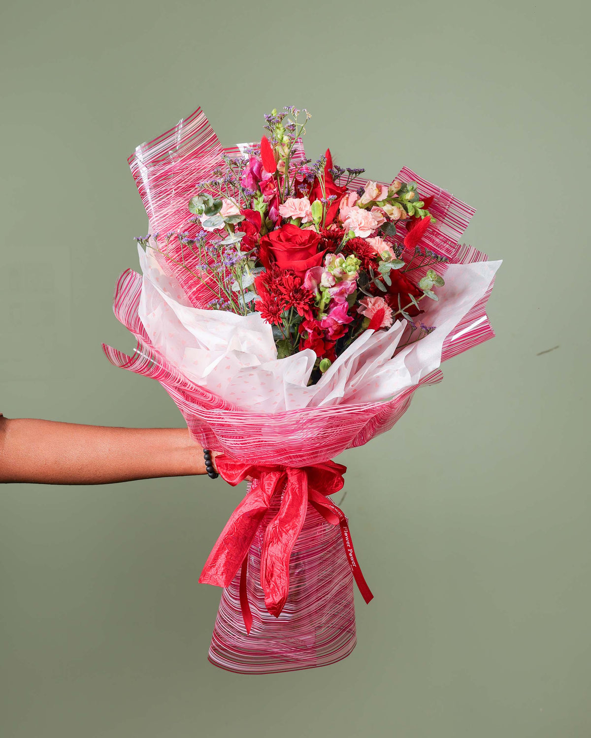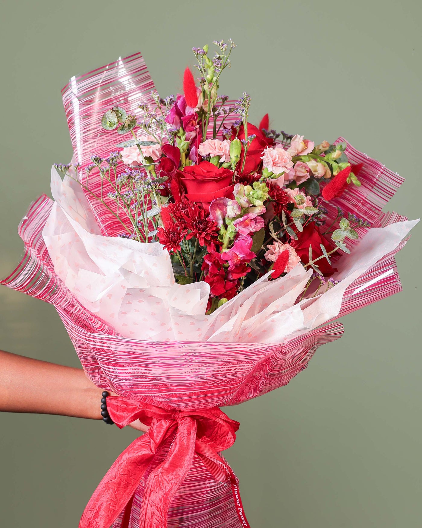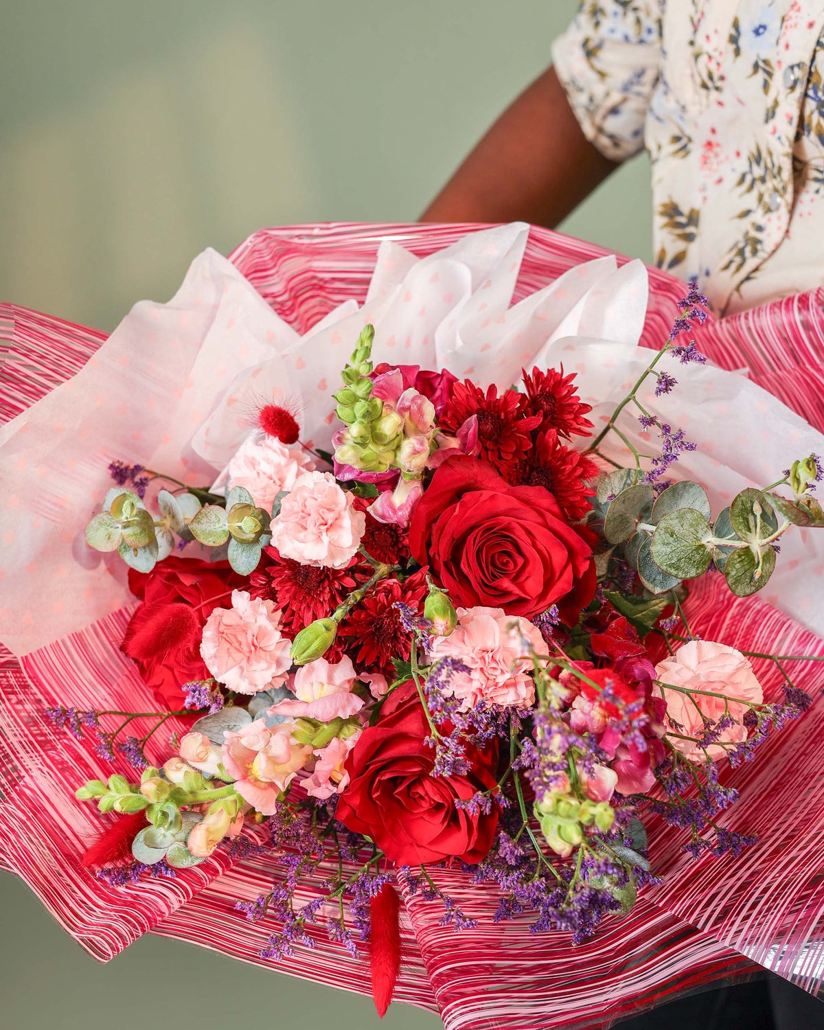 This romantic core is surrounded by an artistic meadow of red chrysanthemums, light pink carnations, and playful bunny tails. With the added height of snapdragons and the soft texture of limonium and eucalyptus, The Triple Promise is a poetic way to speak from the heart. It is elegantly hand tied and wrapped in signature textured paper, finished with a classic red ribbon.